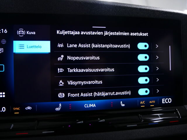 Teknologia-paketti sis. Front Assist (8J3), Kaistallapitoavustin "lane assist" (6L1), Rengaspainevaroitin (7K1) - Monitoimikamera kuljettajaa aavustavia järjestelmiä varten (QK1)